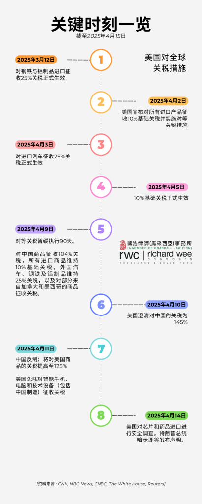 目前尚不确定马来西亚所面临的24%对等关税在为期90天的暂缓执行期后是否将继续维持。可以确定的是,在特朗普总统实现其征收关税背后的目的之前,企业必须把新政策及其反复调整视为“新常态”。就在本周,美国总统特朗普表示,半导体与科技产品目前获得的关税豁免只是“暂时性的”,直到美国能够在本土生产同类产品为止。